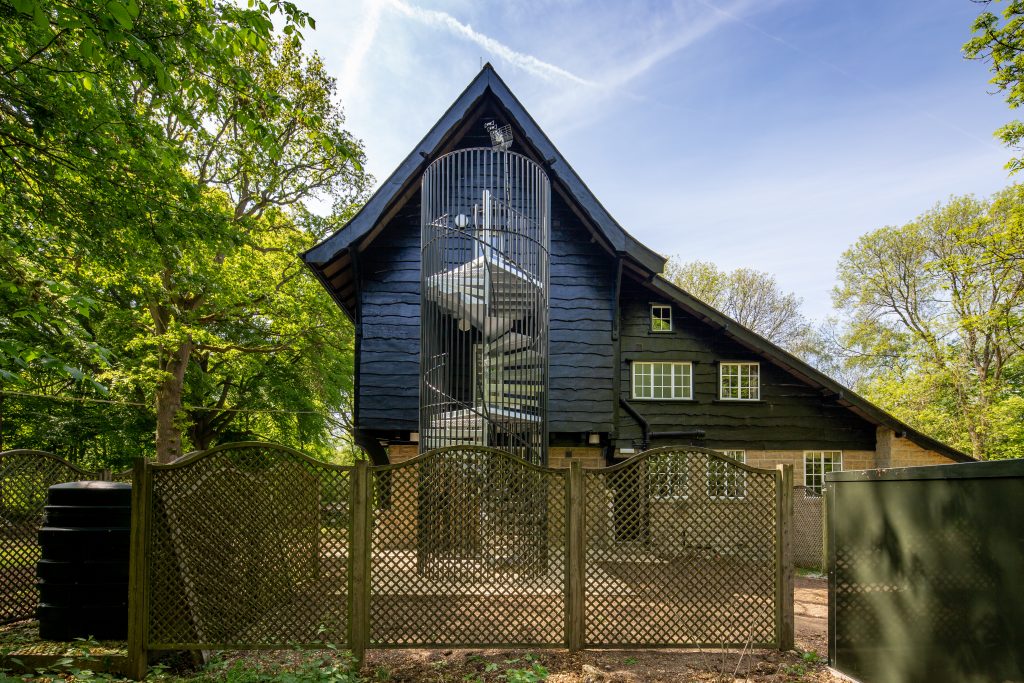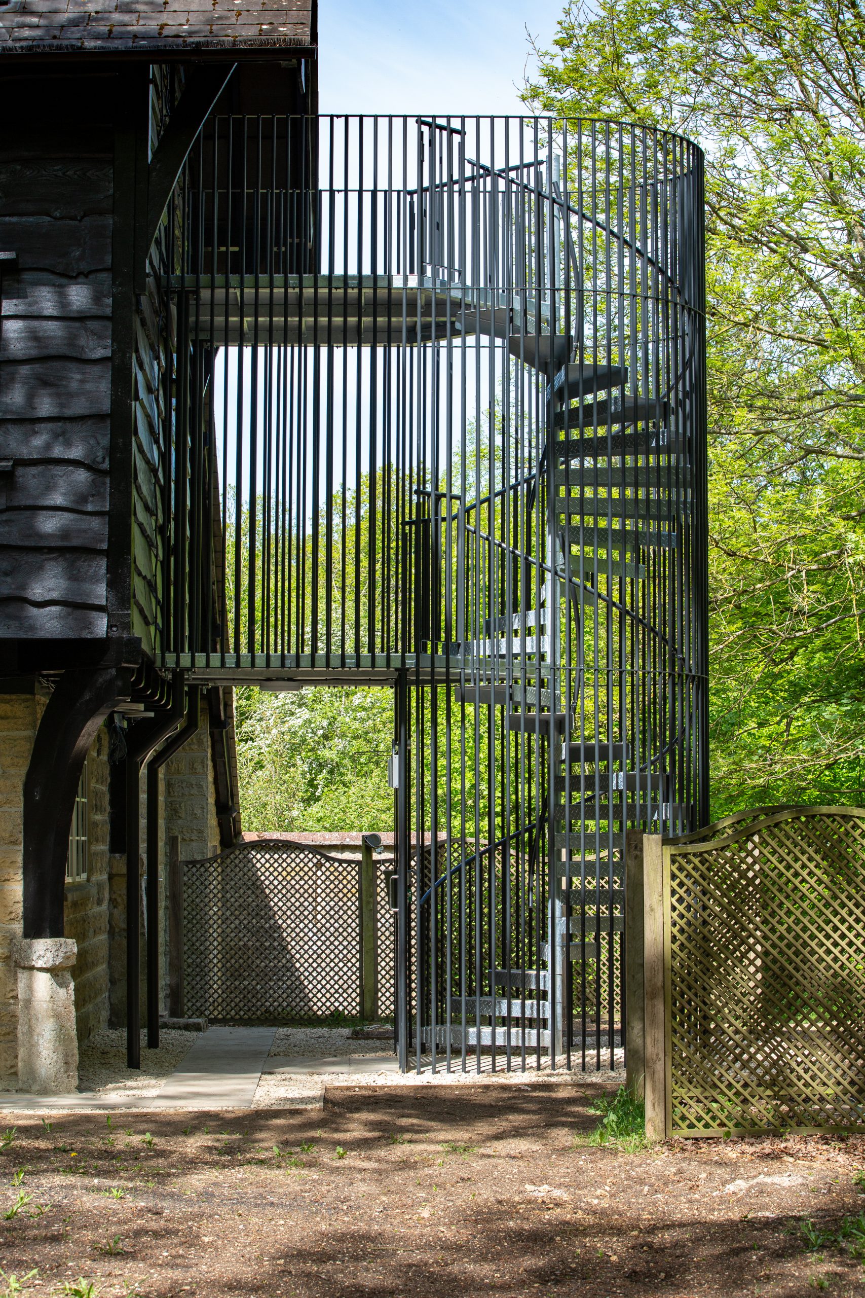 This stair formed part of our design portion for the project and we employed Spiral UK for this purpose. Between the architect, Richard Ward, and Spiral UK we came up with a stunning solution to the problem that blends harmoniously with the existing building and adds character in its own right – https://www.spiral.uk.com/case-studies/wytham-chalet-oxford-university