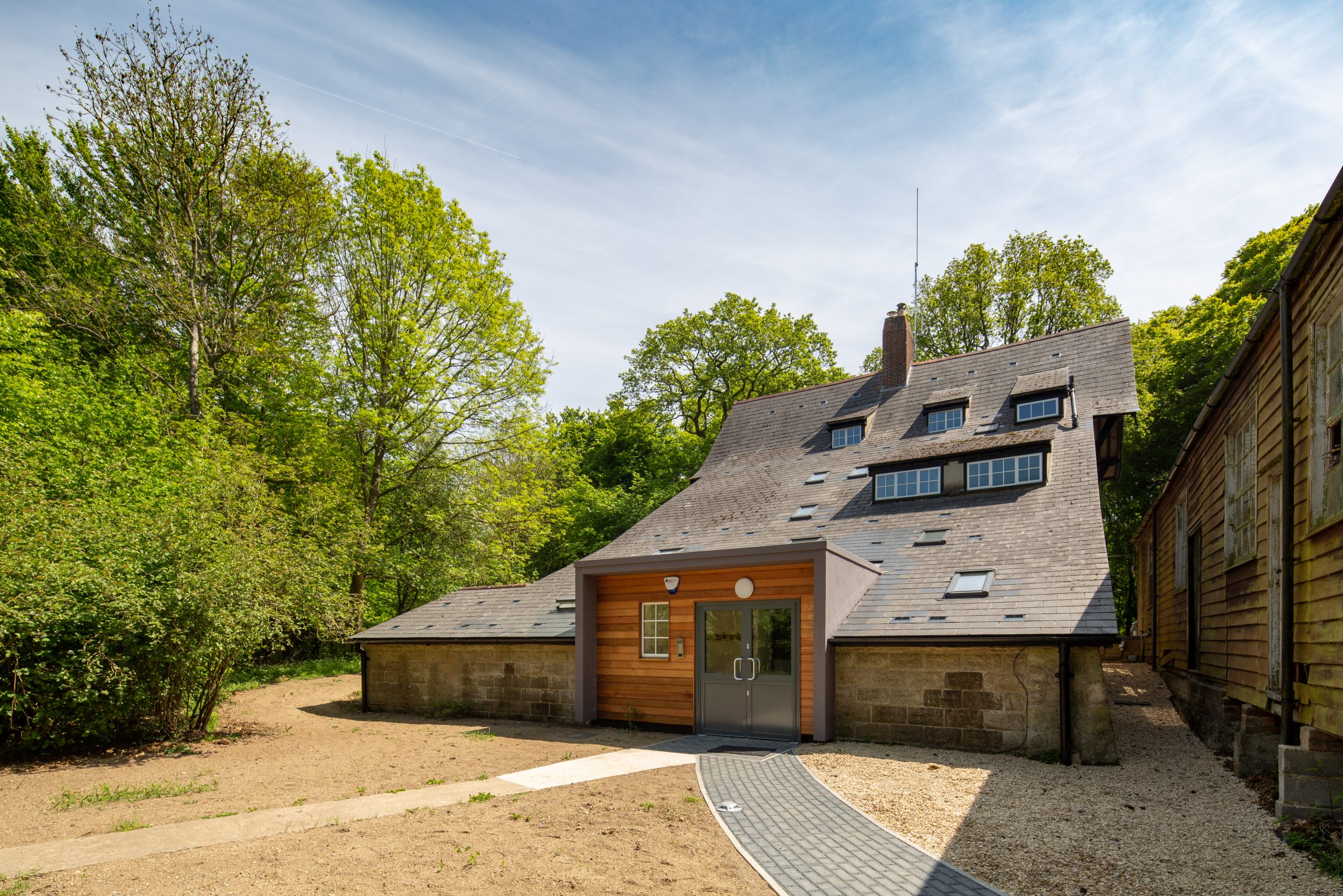 Being of a timber-framed construction Richard Wards extensive carpentry and joinery expertise came into play both restoring existing elements and blending in new items to the existing structure and finishes. A complete redecoration of the oak external cladding and installation of genuine Crittal steel-framed double glazing really lifted the external appearance and new entrance porch to the rear of the building at the base of what became known as the ‘ski-slope’ (the incredible rear slate roof) leads directly into the refurbished research areas and provides new level DDA access.